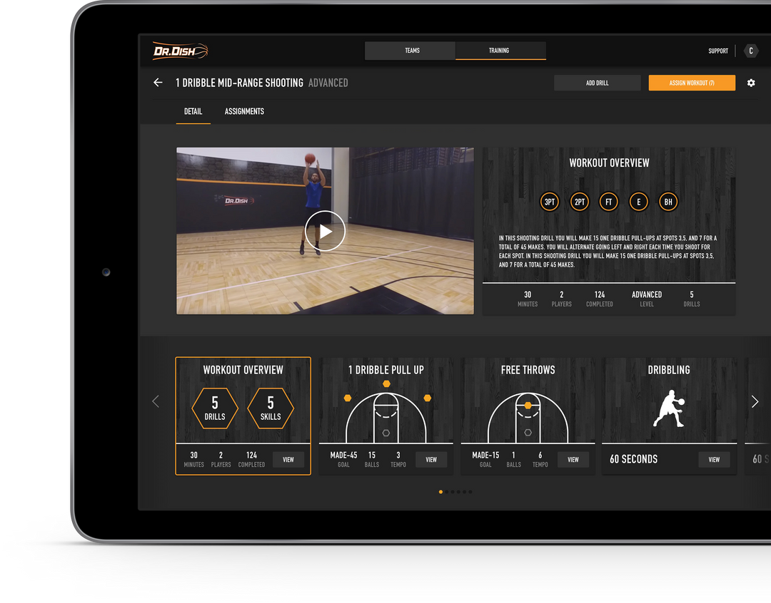 透過使用DR.DISH的系統,將投籃、運球、體能訓練和敏捷訓練等多項訓練結合,打造一個全面的球員。